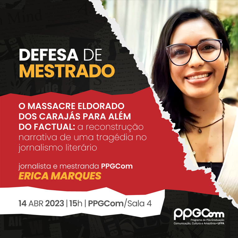 O Projeto Mídia e Violência tem a satisfação de convidar a todos para assistir a defesa pública da tese de doutorado de Erica Marques, a ser realizada na sexta-feira, 14 de Abril de 2022, às 15h (BRT), na sala 4 do PPGCom na UFPA. A dissertação intitulada “O MASSACRE ELDORADO DOS CARAJÁS PARA ALÉM DO FACTUAL: a reconstrução narrativa de uma tragédia no jornalismo...